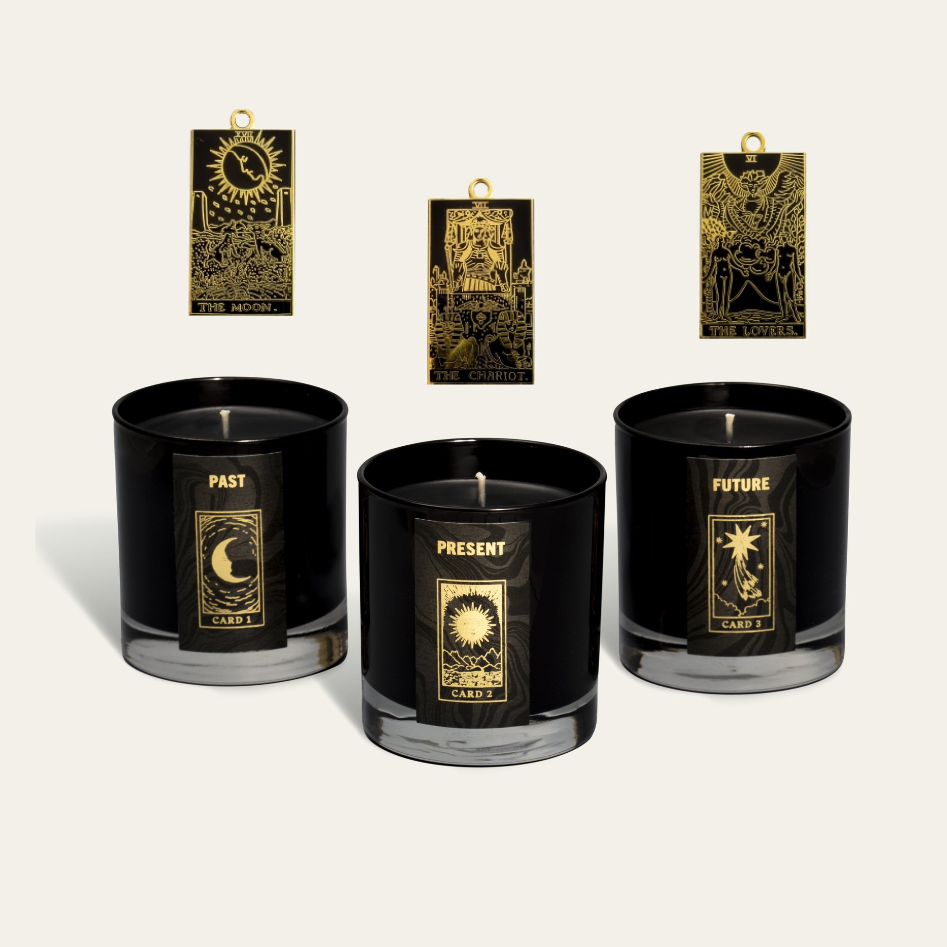 Each candle in your trio hides a little tarot surprise—a gold-plated charm featuring a card from the Major Arcana deck! As the wax melts, your charm will be revealed, ready for you to uncover its meaning with the included guidebook. A little mystery, a little magic, and a lot of fun!